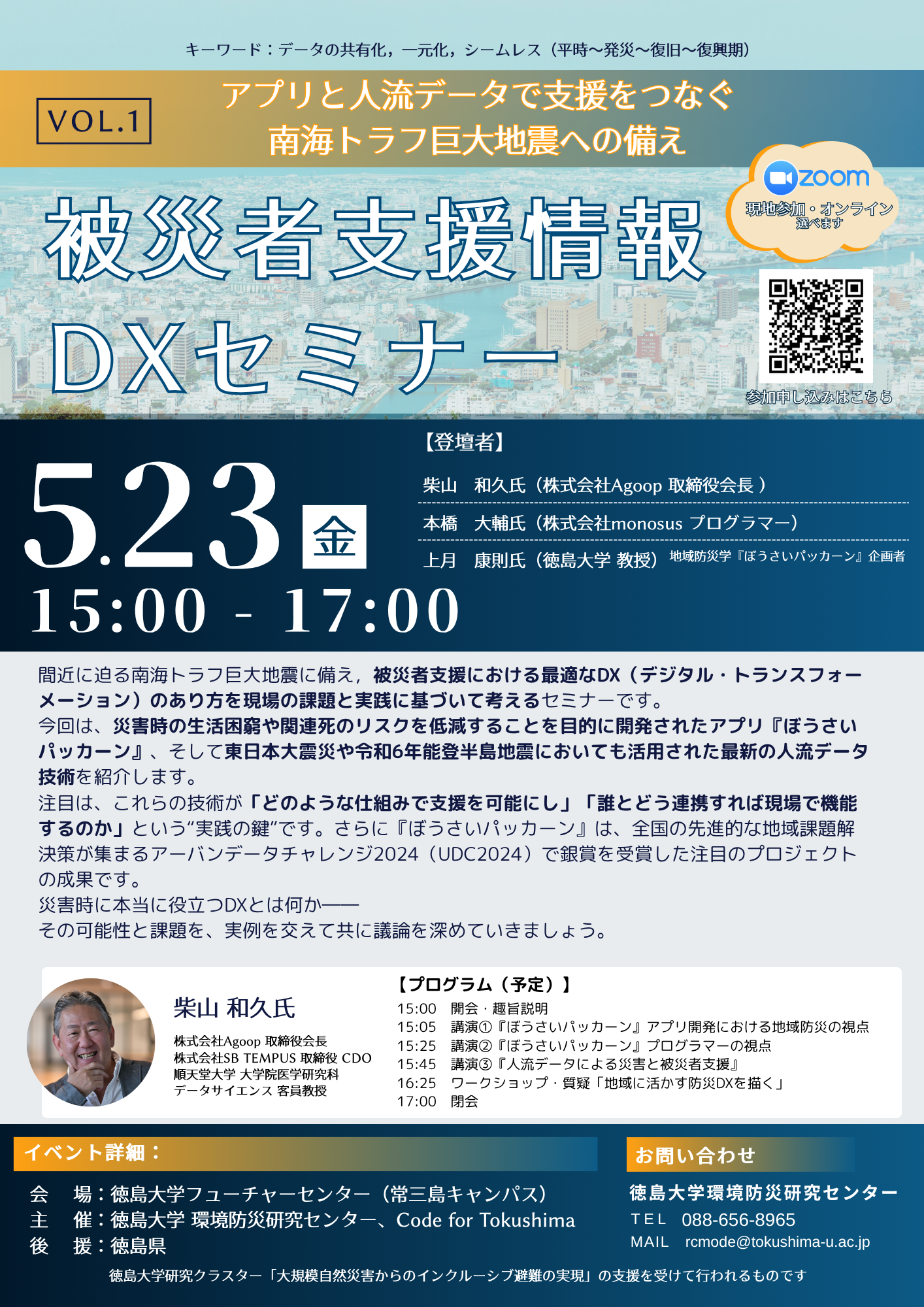 最新の研究成果から現場実装までを一度に学べます。 徳島発の「ぼうさいパッカーン」や「みまもるくん」の実践報告に加え、赤十字や自治体の最新事例、全国の防災DX動向をゲストとともに共有します。